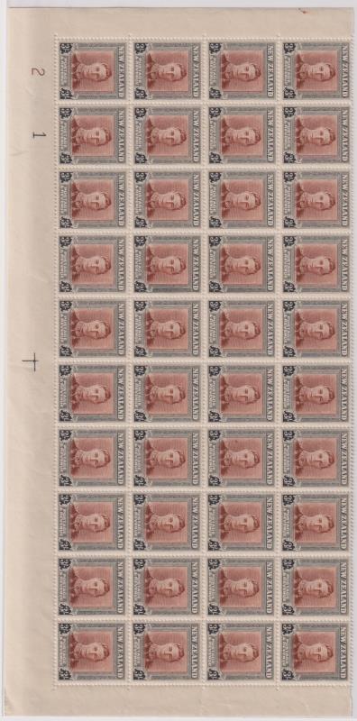 1942 2½d Lilies, mult wmk, p13¾ x 13½ sheet (folded) of 60 incl Plate No 4 with burele band, R1/1 stalk to flower flaw, R8/6 line across flower flaw & R10/4 re-entries. CP L5f(x)-(z). Cat $475. MUH.