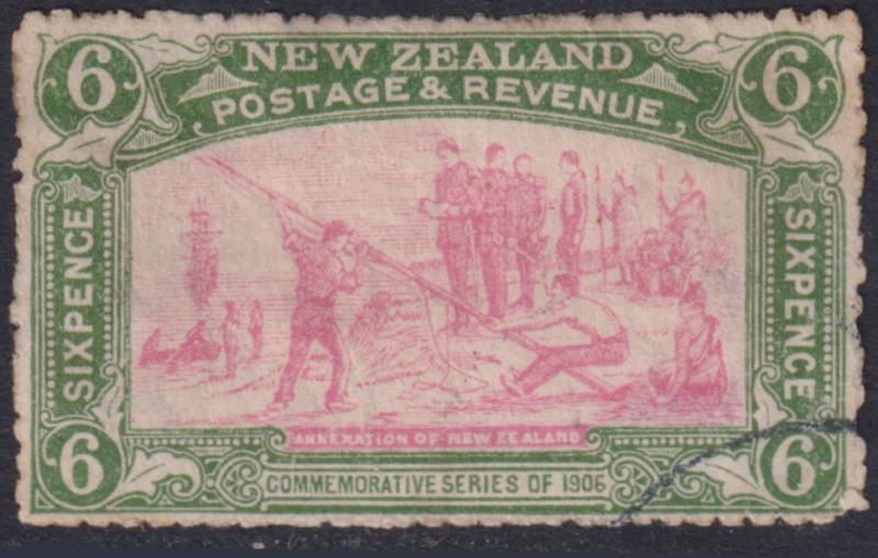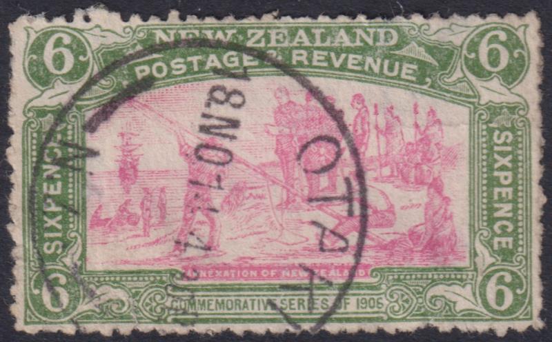1906 6d Christchurch Exbn, small back thin. Nice "Otaki 18 NOV 14" cds. Jury cat $600. FU. (Image)