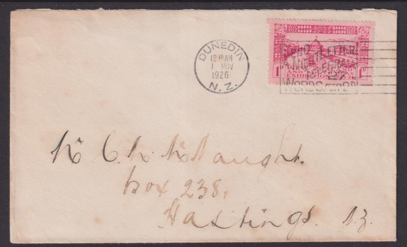 1925 1d Dunedin Exbn used on cover to Hastings, Dunedin, 1 Nov 1926 slogan cancel, cover odd tone. (Image)