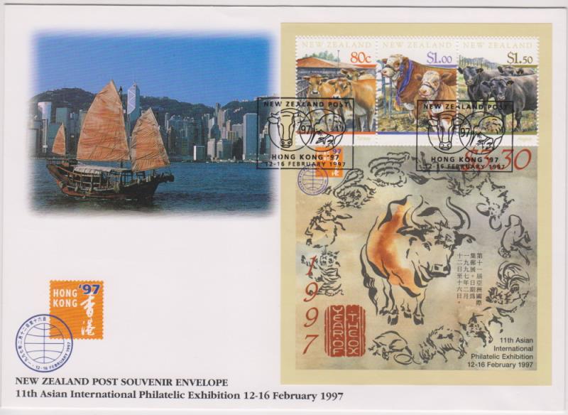 1997 Hong Kong Exbn m/s (Year of the Ox) on official illustrated FDC. Jury cat $40. (Image)