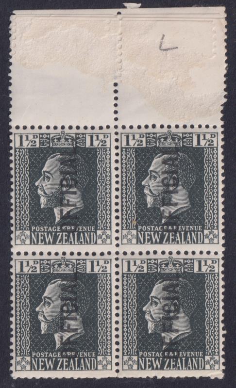 1916 1½d GV black in top marginal block of 4, shortened perfs at base & adhesion top of selvedge. CP KO17a. Cat $140.