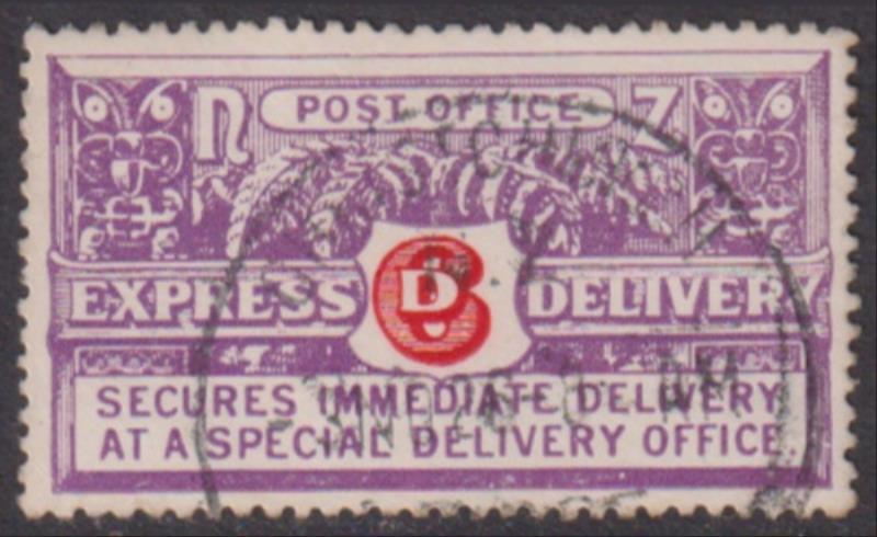1925 6d Express Delivery, Fernleaves, vermilion & purple, Cowan, p14 x 14½. CP U1b(2). Cat $80. FU.