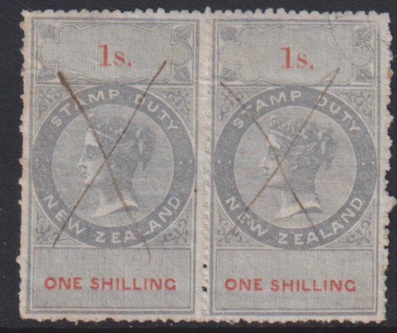 1720 R image1867 1/- QVLT grey & red horiz pair, die I, value at base in 1 line, NZ wmk invtd & reversed, H-roulette on all sides. M/s "X" cancel on each. Horiz crease through both. Rare experimental separation. Attractive multiple. Kiwi R259j. Cat $1300+. (Image)