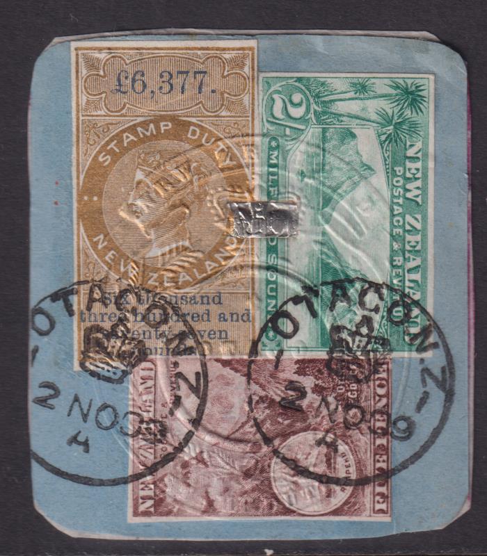 1877 £6377 QVLT ultra high value 4 margins, foil tied to document piece 1+ trimmed 2/- Milford (& also 5d Otira). Attractive.