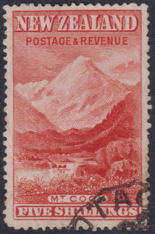 1898 5/- Mt Cook, unpunched, fine corner "Otago" fiscal cancel. FU. (Image)