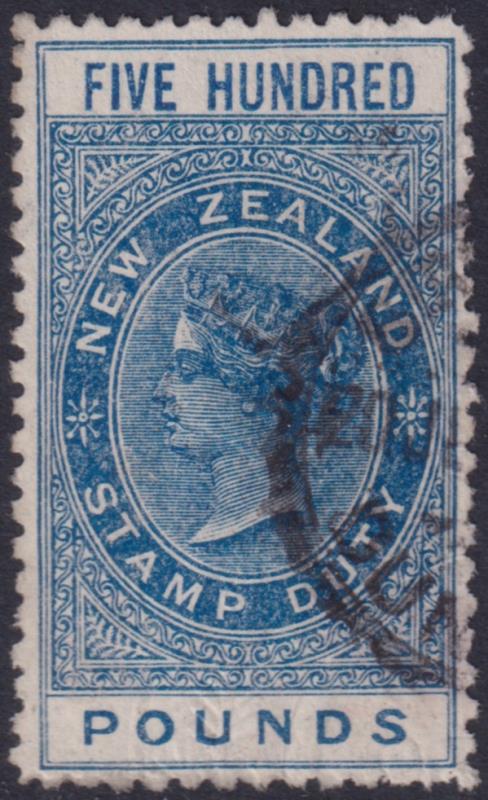 1903 £500 QVLT, p11, sideways invtd wmk, embossed, unpunched, part 20 JL ?? Stamp Office, Dunedin cancel. Only 2400 printed.