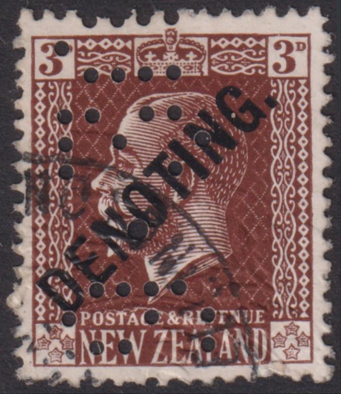 1924-37 "DENOTING" ovpt on 3d GV chocolate (surface print), p14 x 15, Cowan paper. Perfin punched used. Kiwi R47a. Cat