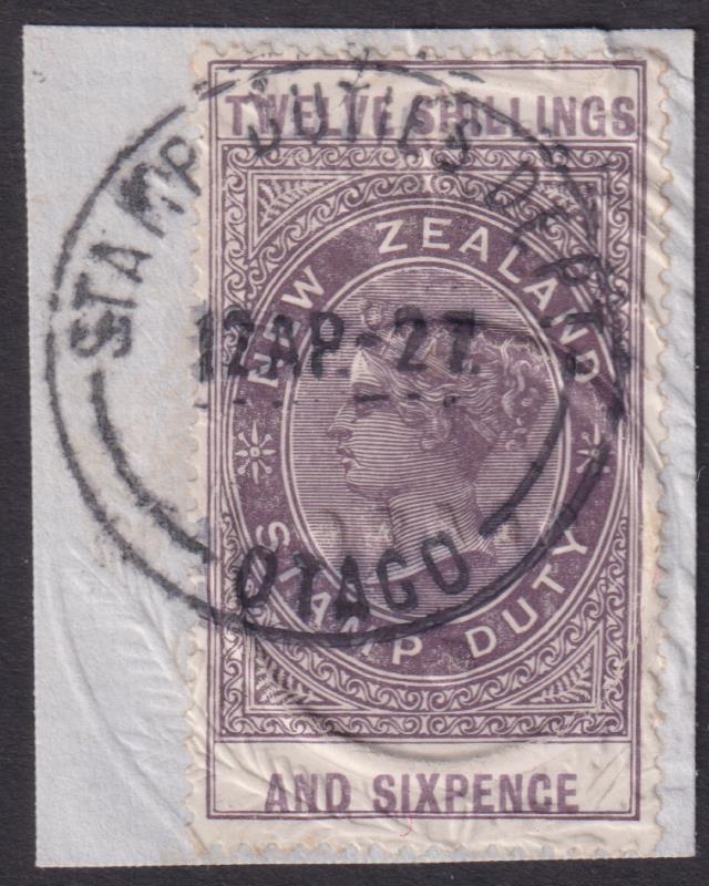 1925 12/6 QVLT blackish purple, Cowan paper, on piece, not punched. Kiwi R461K. Cat $25. (Image)