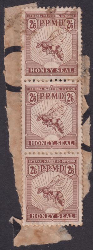 1938-53 2/6d Honey Seal brown P.P.M.D vert strip of 3 on piece - part (PR)ODU(CE) printed. A scarce stamp infrequently seen