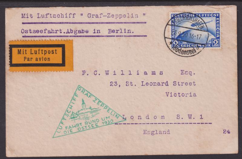 1858 C imageGermany 1930 Graf Zeppelin flown cover to London with 2pm Zeppelin & green triangular Baltic Sea cachet, Friedrichshafen 23.9.30 cds & Berlin transit cancel. Minor ageing. (Image)