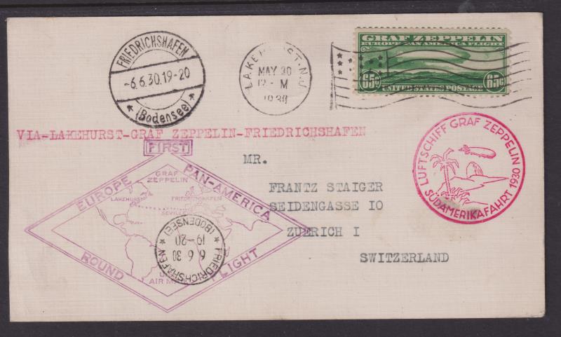 1911 C imageUSA 1930 65c Graf Zeppelin cacheted card to Zurich, Lakehurst 30 May cancel & Friedrichshafen 6 June arrival cancel. Scott C13. Cat US$160. (Image)