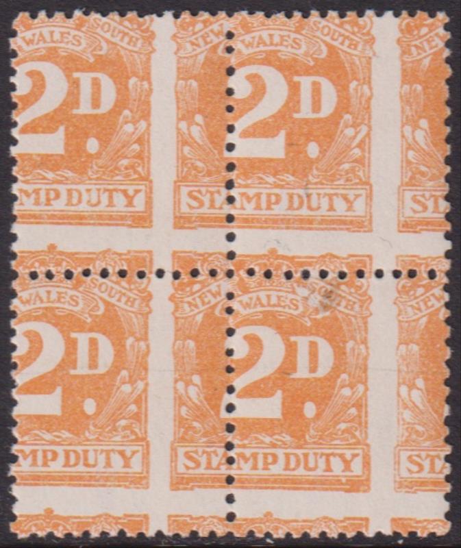 1915 R imageNSW 1929-50 2d Stamp Duty, p12 x 11¼, yellow, GNSW wmk a spectacular misperfed block of 4 (3mm down & 7mm to right). MUH. (Image)