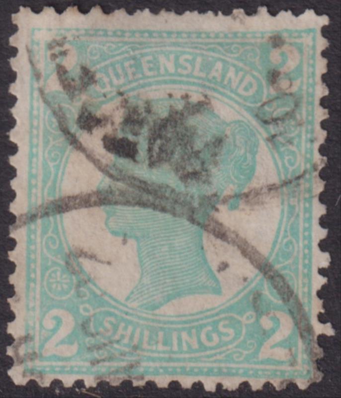 1917 U imageQueensland 1897 2/- QV turquoise-green, crown over Q wmk, double cds. SG 254. Cat £55. GU/FU. (Image)