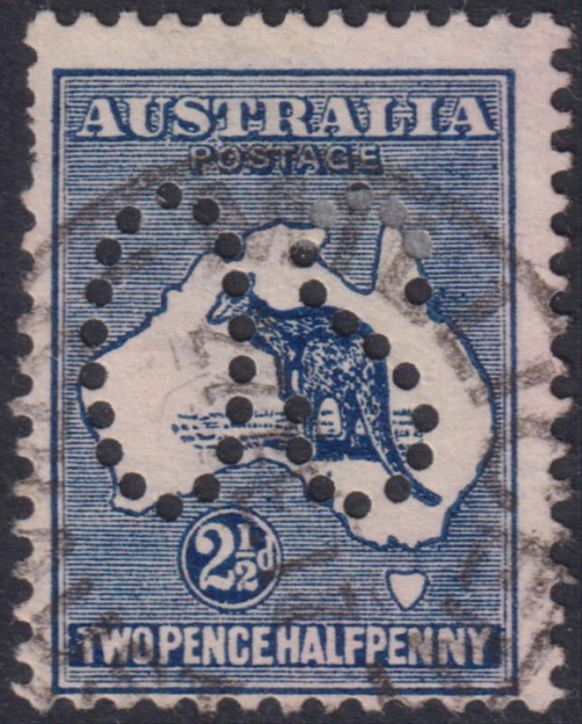 1913 2½d Roo indigo, large OS perfin, o/c, 2 short perfs. SG O4. Cat £180. FU. (Image)