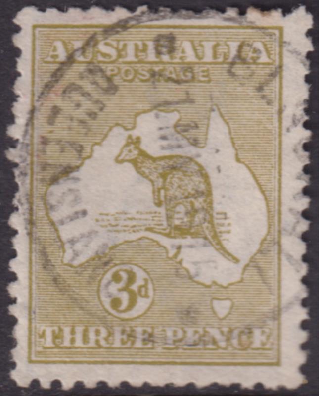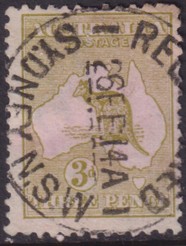 1913 3d Roo yellow-olive, die II, 1st wmk, invtd wmk. Rare. SG 5ew. Cat £400. FU. (Image)
