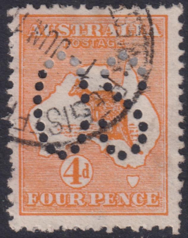 1913 4d Roo orange, large OS perfin. SG O6. Cat £24. FU. (Image)