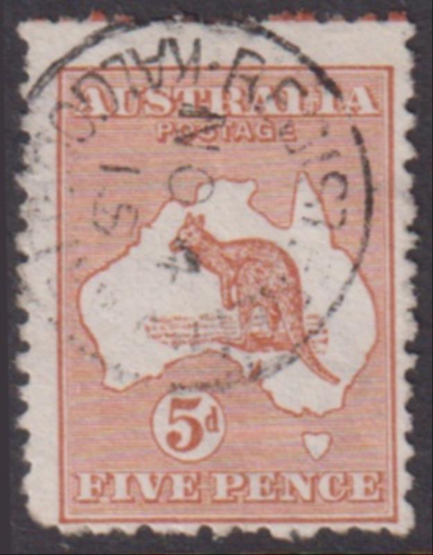 1913 5d Roo chestnut, centered low, slightly short corner, neat small "Kalgoorlie 1915" cds. SG 8. Cat £48. FU. (Image)