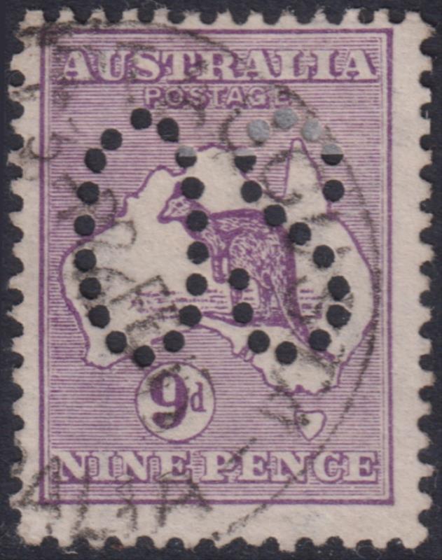 1913 9d Roo, large OS perfin, creased corner. SG O9. Cat £65. FU. (Image)