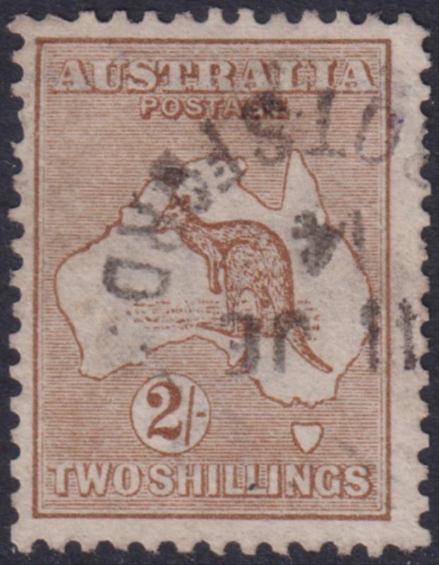 1913 2/- Roo brown, 1st wmk. SG 12. Cat £110. FU. (Image)