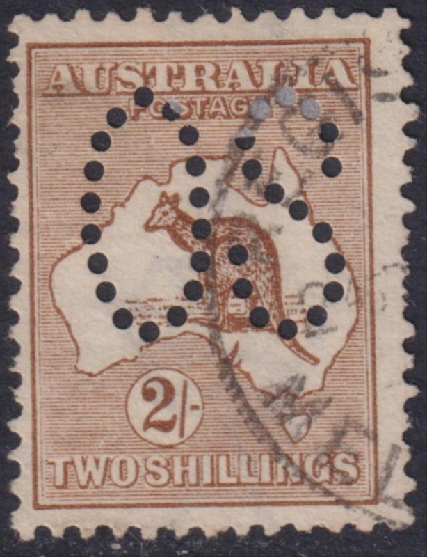 1913 2/- Roo brown, large OS perfin, 2 short perfs. SG O11. Cat £180. FU. (Image)