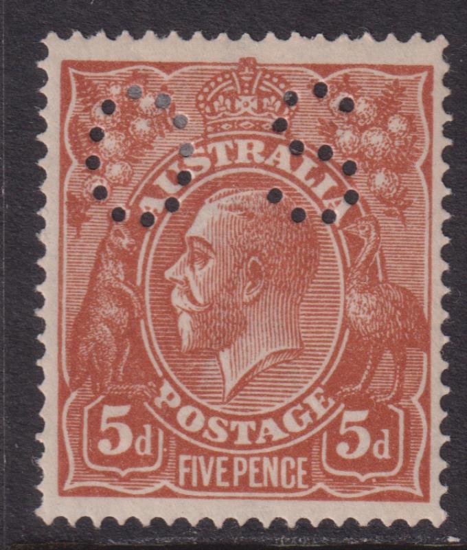1914 5d Roo chestnut, 1st wmk, small "O S" perfin (Official), 1 short perf. SG O22. Cat £65. FU.