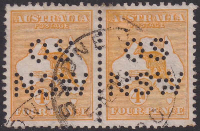 1914 4d Roo horiz pair, punctured "OS NSW". FU. (Image)