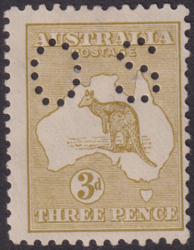 1915 Roo yellow-olive, die I, single crown over A wmk, with "OS" perfin. SG O45. Cat £75. Mint. (Image)