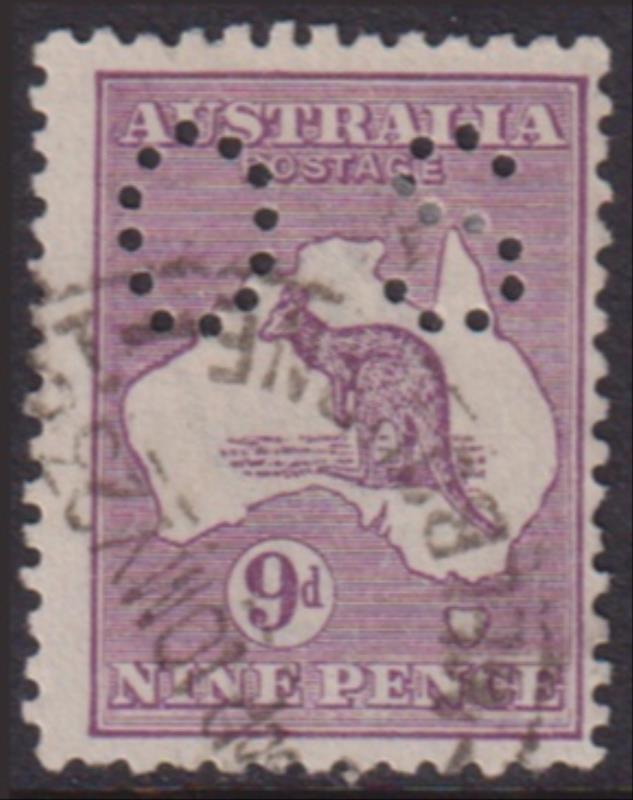 1915 9d Roo, die IIB, perfinned small OS. SG O47b. Cat £42. FU. (Image)