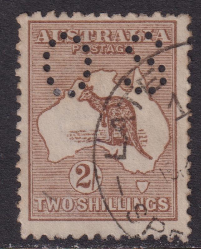 1915-28 2/- Roo, small OS perfin. SG O49. Cat £20. FU. (Image)