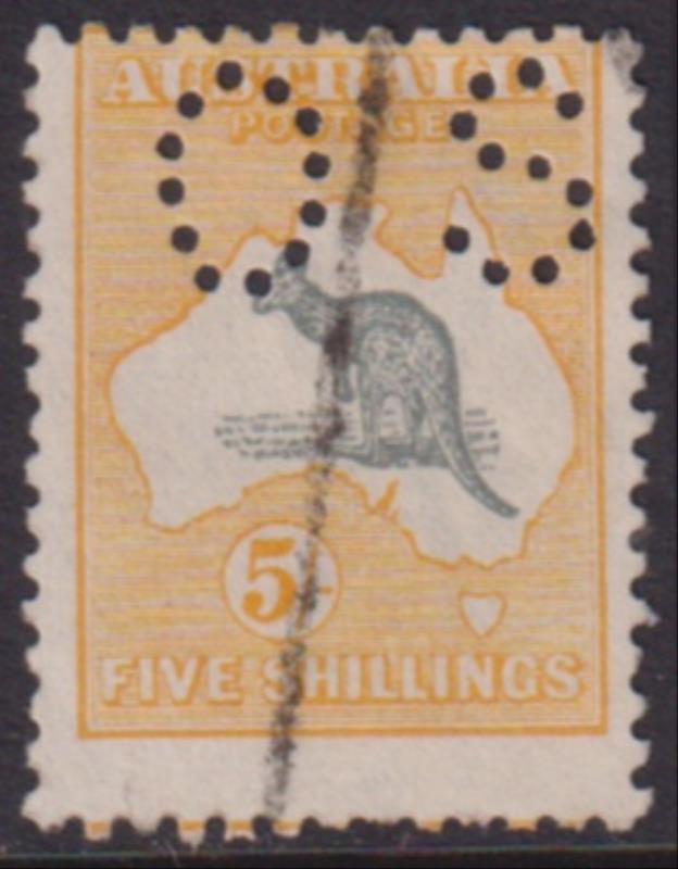 1915-8 5/- Roo, small OS perfin, well o/c, 2 short perfs at foot. SG O50. Cat £90. FU. (Image)