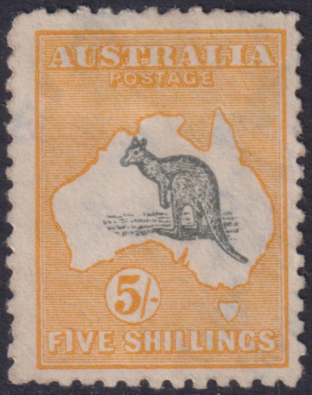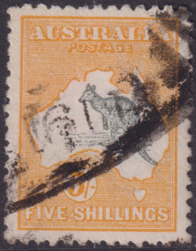 1915 5/- Roo grey & yellow, 2nd wmk (SG type 5 wmk), invtd wmk. Heavy black parcel cancel. Rare. SG 30w. Cat £550.