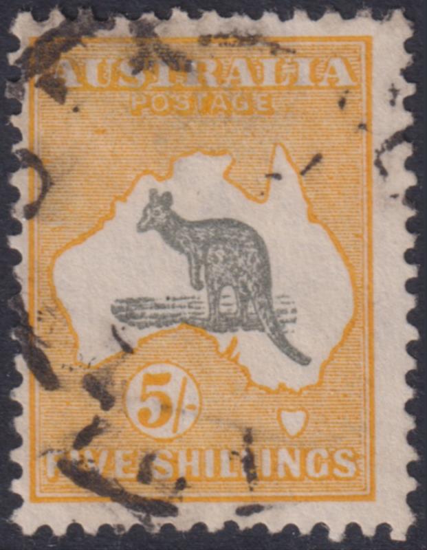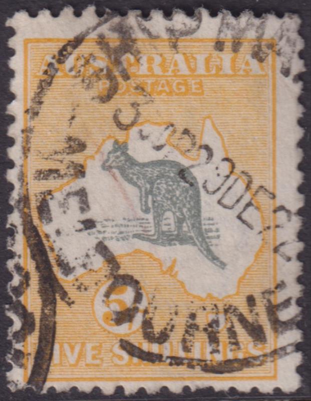 1918 5/- Roo grey & yellow, 3rd wmk (SG type 6), ship mail room/Melbourne steel cds. SG 42. Cat £120. GU. (Image)