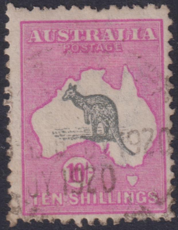 1918 10/- Roo grey-pink, 3rd wmk, 1 pulled perf. SG 43a. Cat £325. (Image)