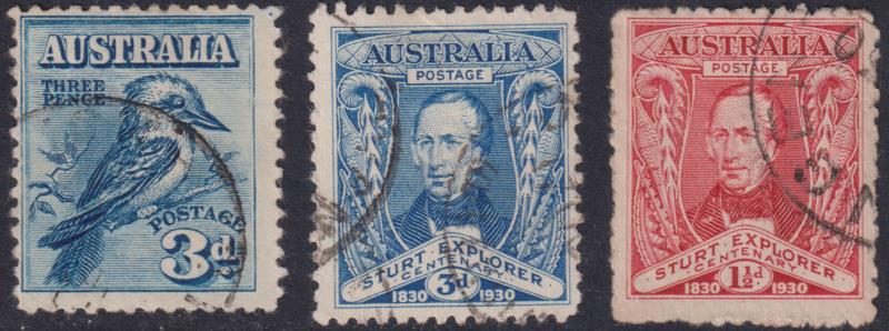1928 3d Kookaburra, 1928 Sturt set. SG 106, 117-8. Cat £22. FU. (Image)