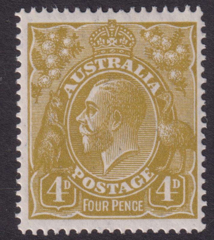 1928 4d GV yellow-olive, p14, multiple crown over A wmk. SG 91. Cat £70. Mint. (Image)