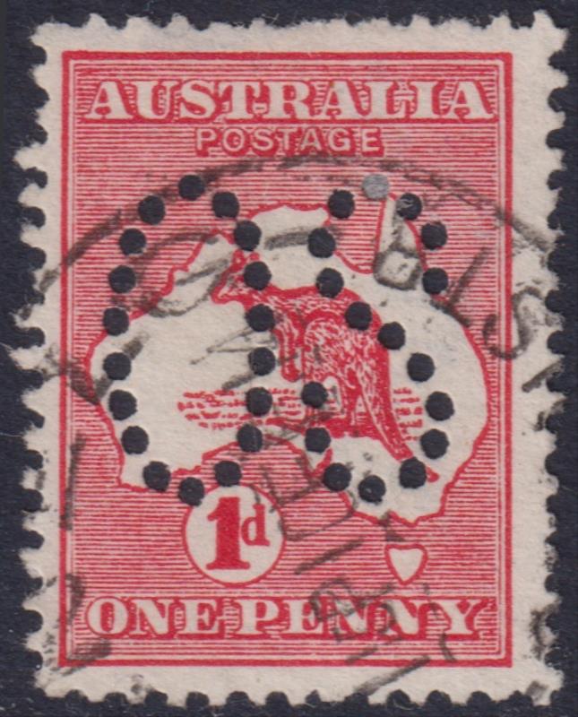 1913 1d Roo, die 2, perfinned large OS. SG O2d. Cat £16. FU. (Image)