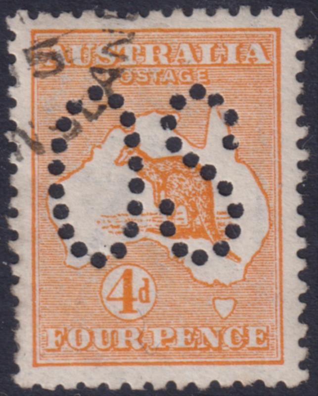 1913 4d Roo, perfinned large OS. SG O6. Cat £22. FU. (Image)