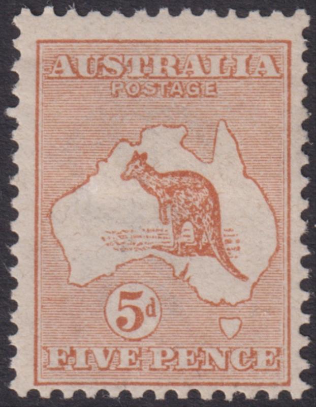 1913 5d Roo chestnut, large crown over A wmk, slightly o/c. SG 8. Cat £100. Mint. (Image)