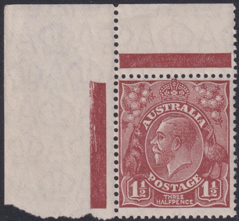 1919 1½d GV chocolate top L/H corner single, wmk crowns. BW 86. Cat A$30. MUH. (Image)
