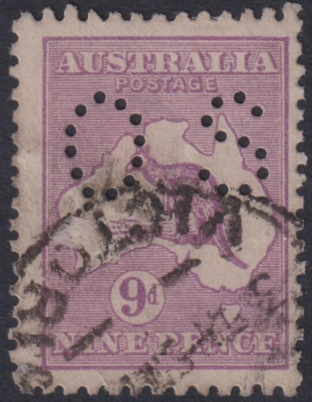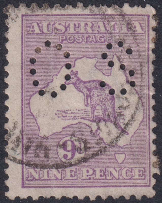 1919 9d Roo violet, die II, 3rd wmk, small OS puncture. SG O47. Cat £38. GU/FU. (Image)
