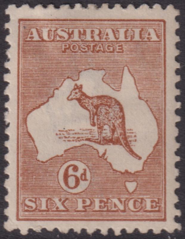 1923 6d Roo brown, narrow crown wmk. SG 73. Cat £28. Mint. (Image)