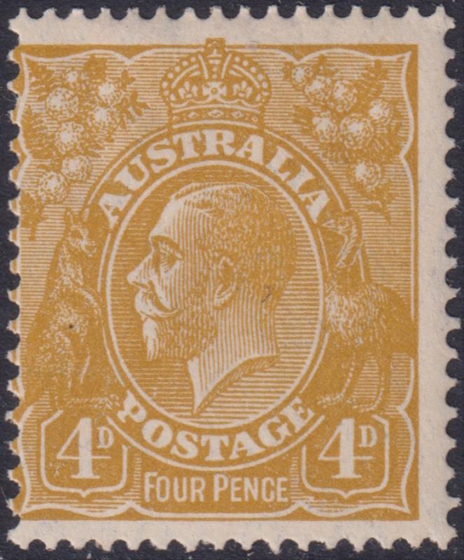 1933 4d GV yellow-olive, p3½ x 12½, crown C of A wmk. O/c. SG 129. Cat £24. Mint. (Image)