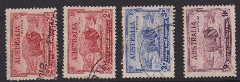 1934 2d, 3d & 9d Macarthur incl 2d "dark hills" variety (4v). SG 150 etc. Cat £58. FU. (Image)