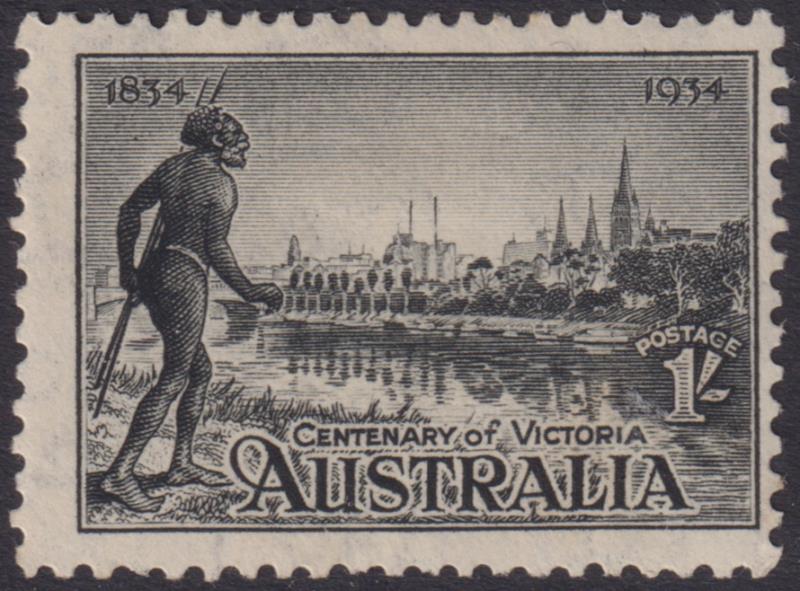 1934 1/- Victoria Centenary black, p11½, darkened gum 1 corner. SG 149a. Cat £65. Mint. (Image)