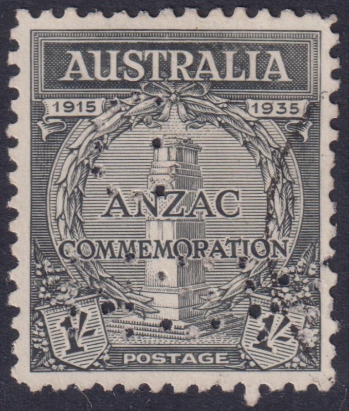 1935 1/- Anzac, "G NSW" perfin. FU. (Image)