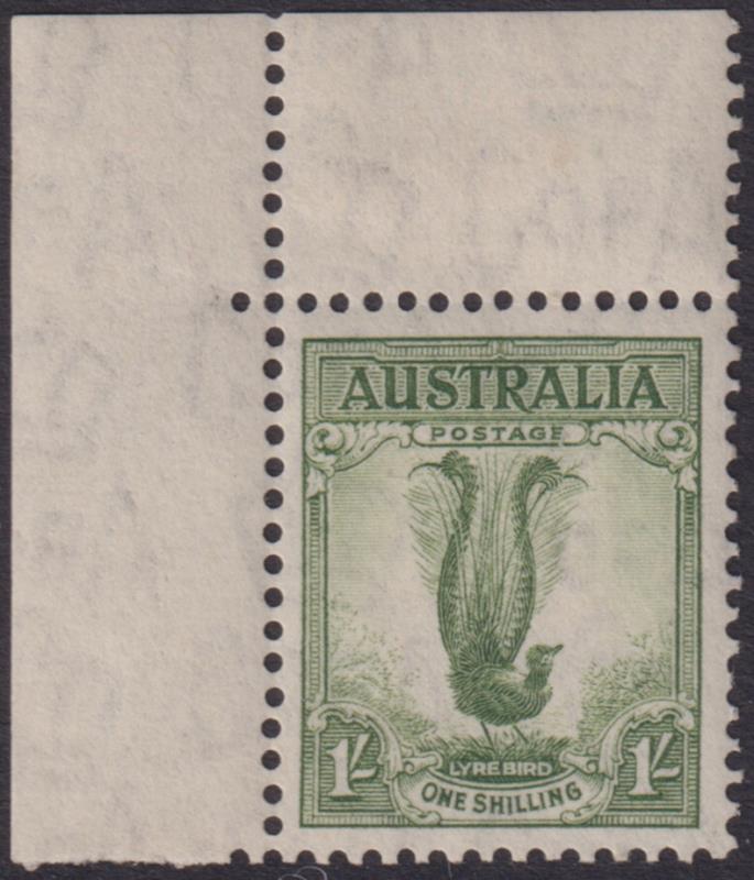 1937 1/- Lyrebird grey-green, p13½ x 14, with top LH corner selvedges. SG 174. Cat £50. MUH. (Image)