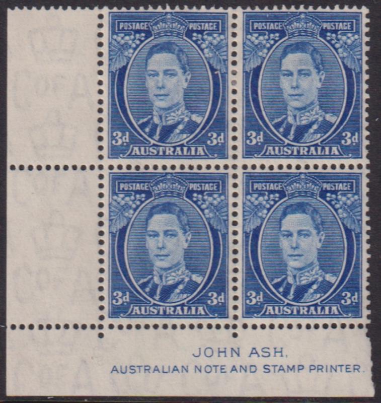 1940 3d GVI bright blue block of 4, die III, p15 x 14, JOHN ASH imprint. BW 195z. Cat A$200. 2 mint/2 MUH. (Image)