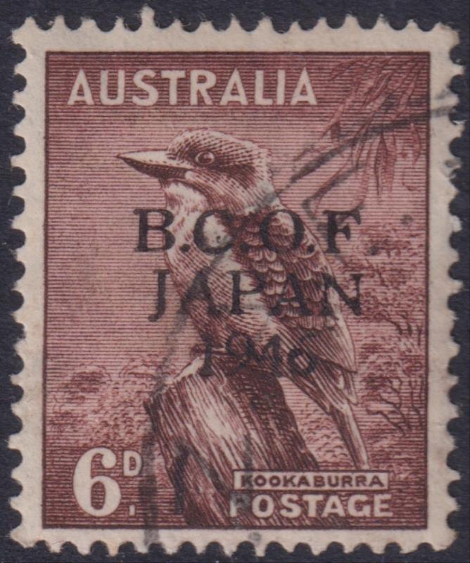 1946 6d Kookaburra, BCOF ovpt. SG J4. Cat £23. FU. (Image)