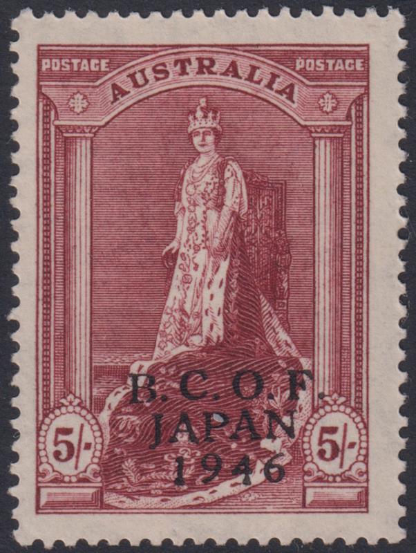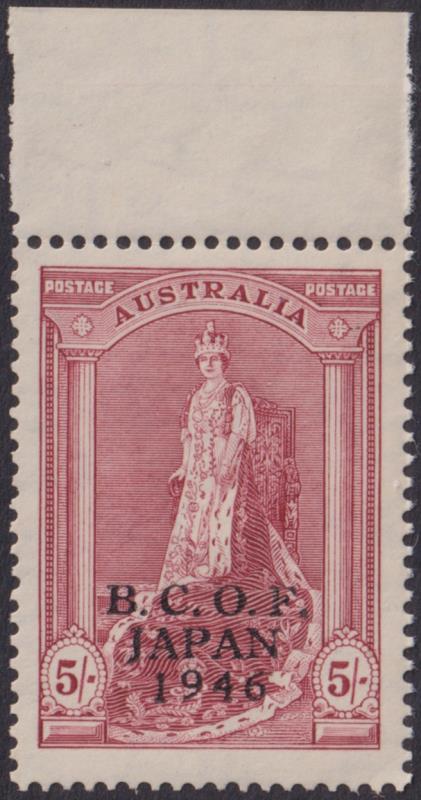 1946 5/- Robes, BCOF ovpt. SG J7a. Cat £130. Mint. (Image)