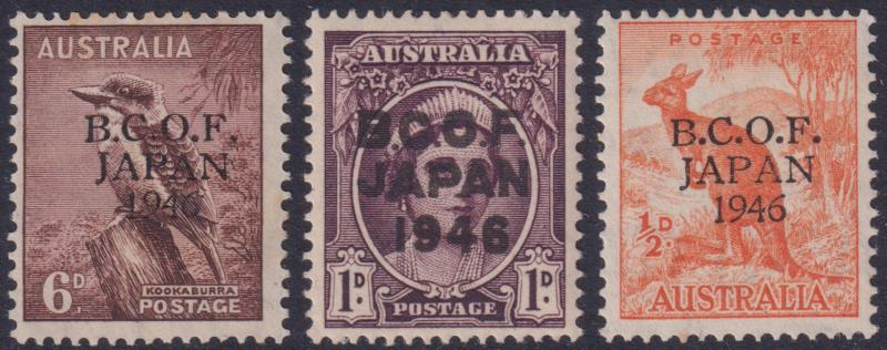 1946 1d, 3d, 1/- BCOF ovpts. SG J2, 3, 5. Cat £32. Mint.